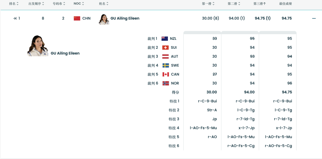 第二跳,卫冕冠军谷爱凌展现出极其强大的心理素质,开场正脚和反脚900度的抓板动作完成度极高,高度也来到了3.8米!连续两次540度Alley-oop的结尾动作相当稳健,得到全场最高94.00分的同时跃升至全场第一!
